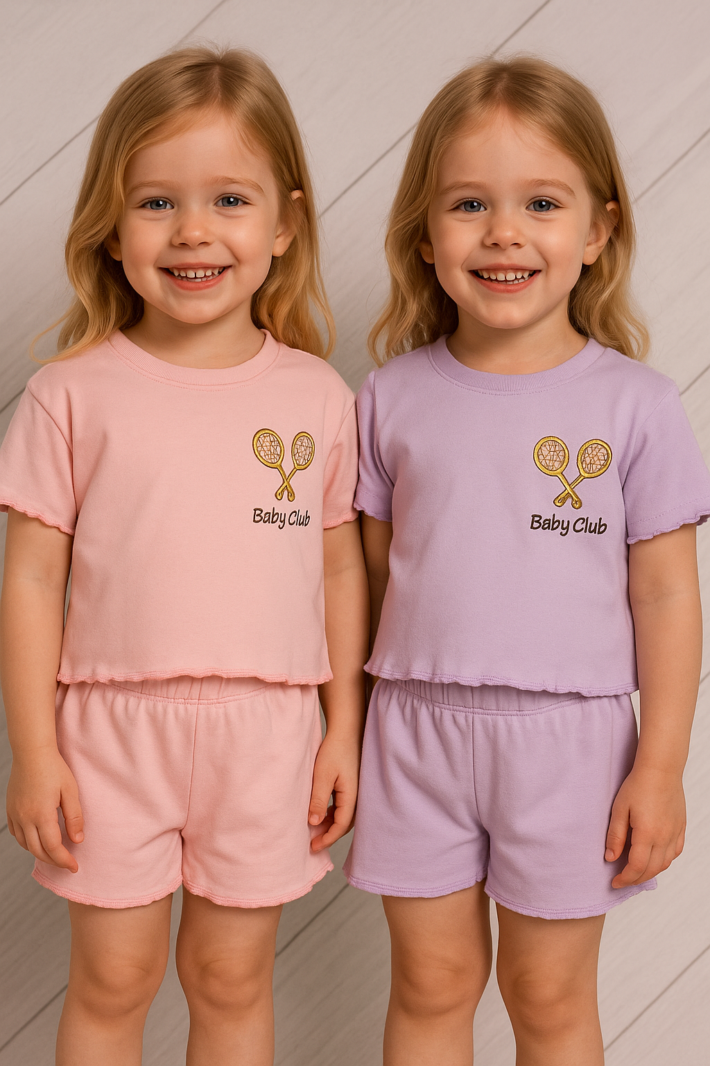 Yazın tatlı esintilerine eşlik edecek bu kız bebek takımı, hem şıklığı hem rahatlığı bir araya getiriyor. Ön kısmında “Baby Club” ve tenis raketi baskısı ile sportif bir dokunuş sunarken, tişört ve şortun uçlarındaki kıvrımlı fırfır dikiş detayları zarif bir görünüm kazandırır. Esnek bel yapısı ve yumuşacık dokusuyla hareket özgürlüğü sağlar.