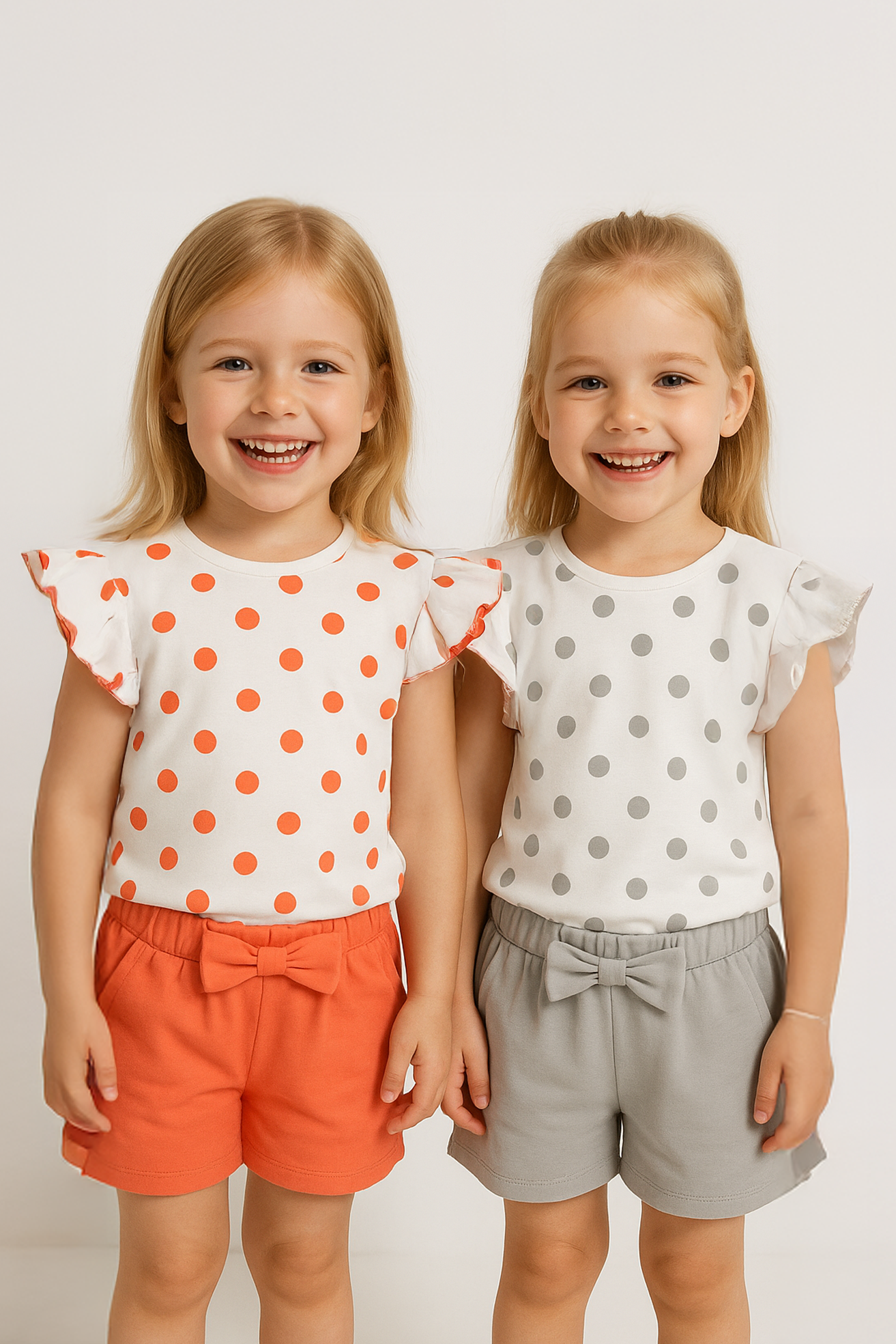 2 Adet Yazlık Puantiyeli Fırfırlı Şortlu Kız Çocuk Takım Gri & Nar Çiçeği (SS25114SRT091)