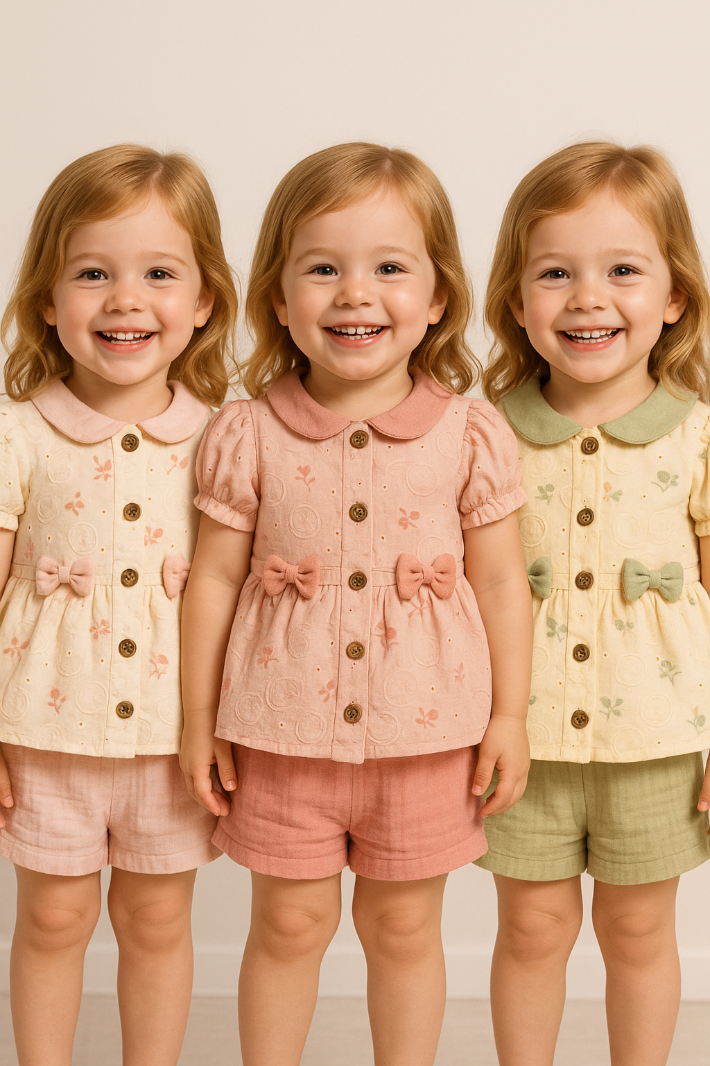 3 Adet Nakış Detaylı Şortlu Kız Bebek Takımı Yeşil,Pembe & Somon
