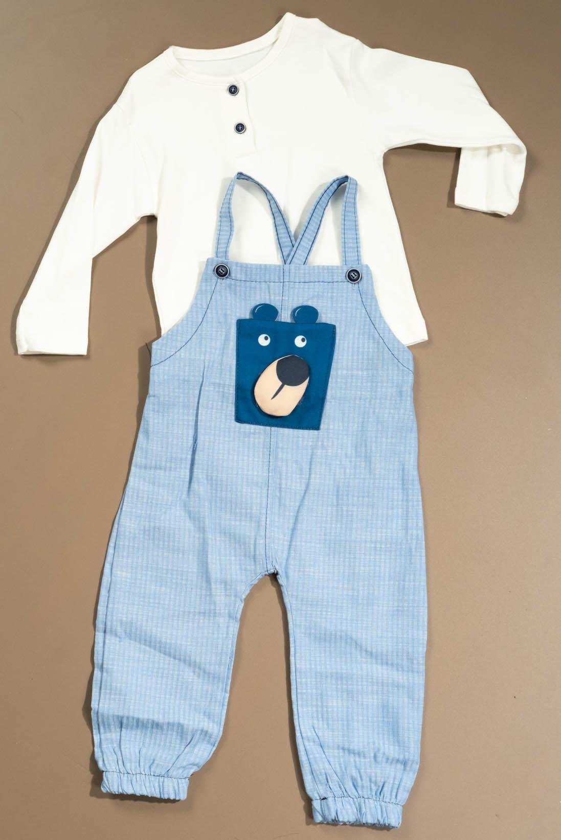 Ayıcık Cepli Askılı Salopetli 2'li Bebek Takımı Çizgili Mavi