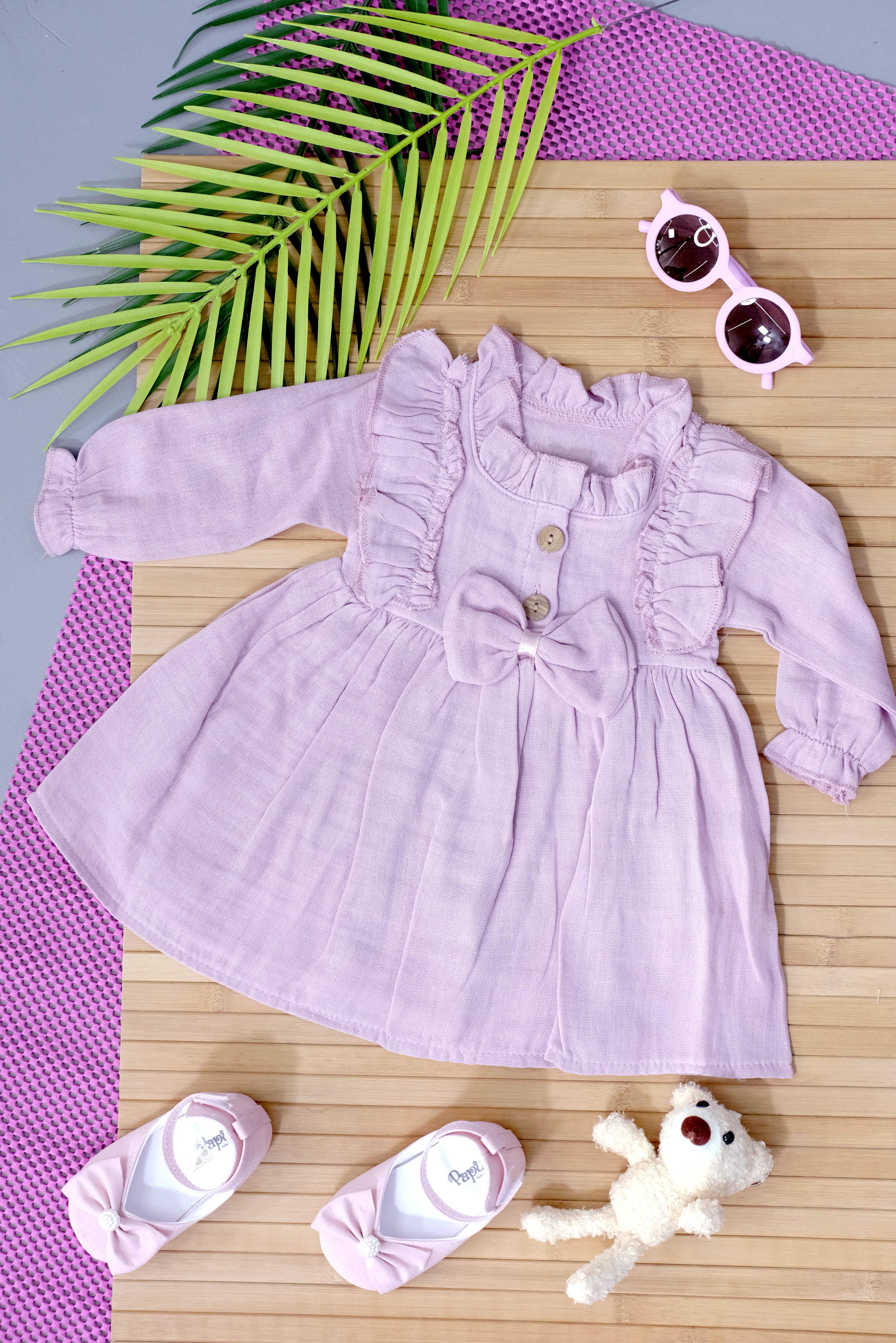 Özet Açıklama: Romantik fırfır detayları, ön fiyonk süslemesi ve yumuşacık müslin kumaşıyla bu uzun kollu kız bebek elbisesi; hem özel günlerde hem günlük kullanımda minik prenseslere şıklık ve konfor sunuyor. Narin lila tonu ile masalsı bir hava katıyor.