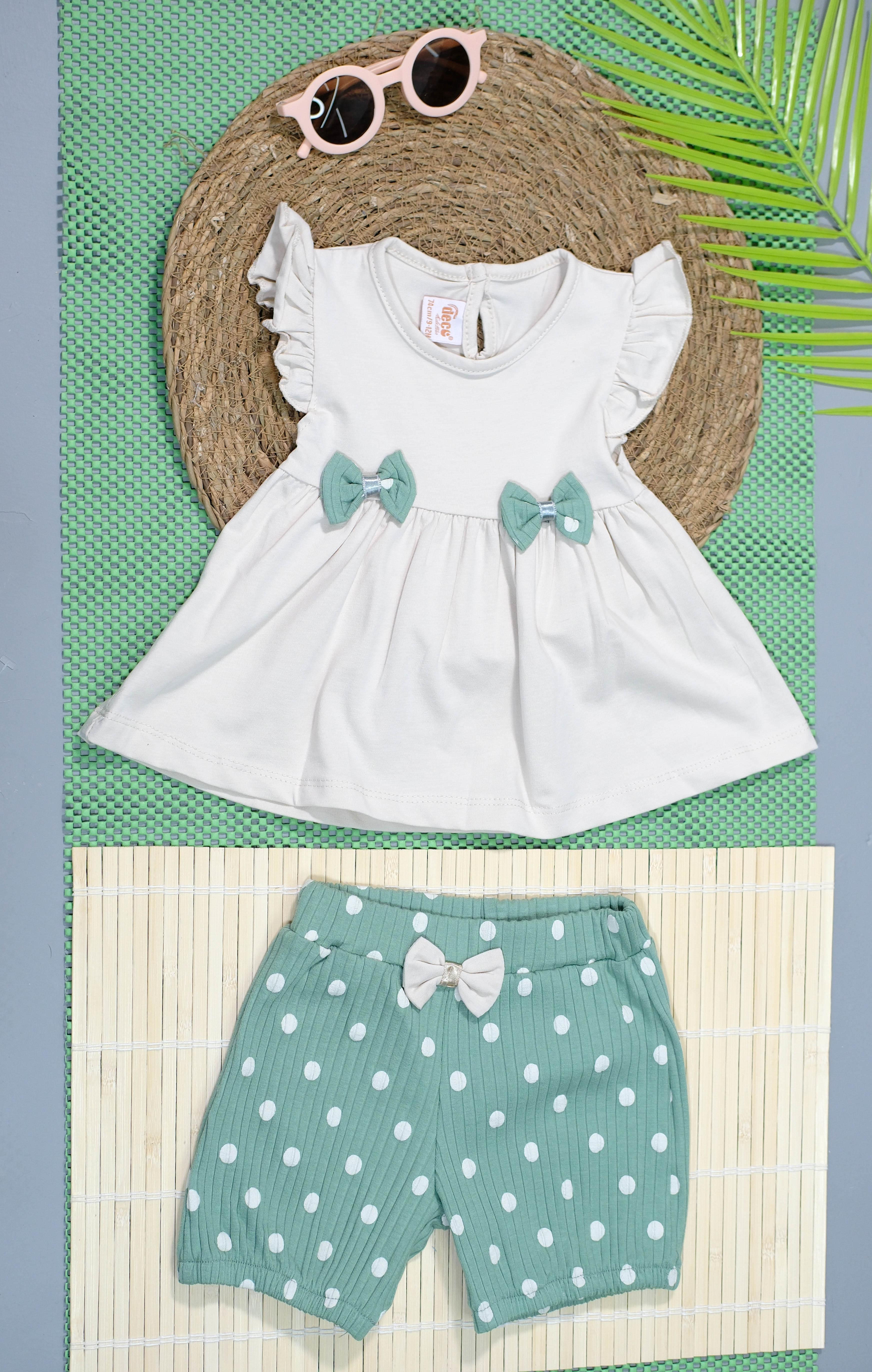 Açıklama: Fırfırlı kollara sahip beyaz tunik üst ve puantiyeli mint yeşili şorttan oluşan bu takım, yaz aylarında minik prenseslere hem rahatlık hem de göz alıcı bir şıklık sunar. Üstteki sevimli fiyonk detayları ve alt parçada yer alan zarif kurdele ile stil tamamlanır.