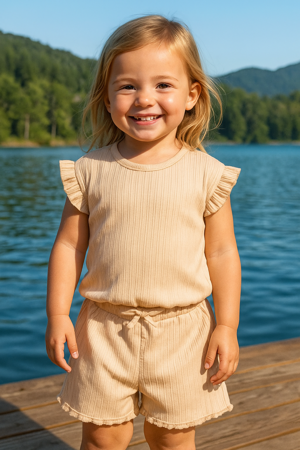 Hafif ve nefes alabilen ribana kumaşıyla üretilen bu şortlu takım, yaz günlerinde minikler için hem konforlu hem de şık bir tercih. Fırfır detaylarıyla zarif bir dokunuş sunar.